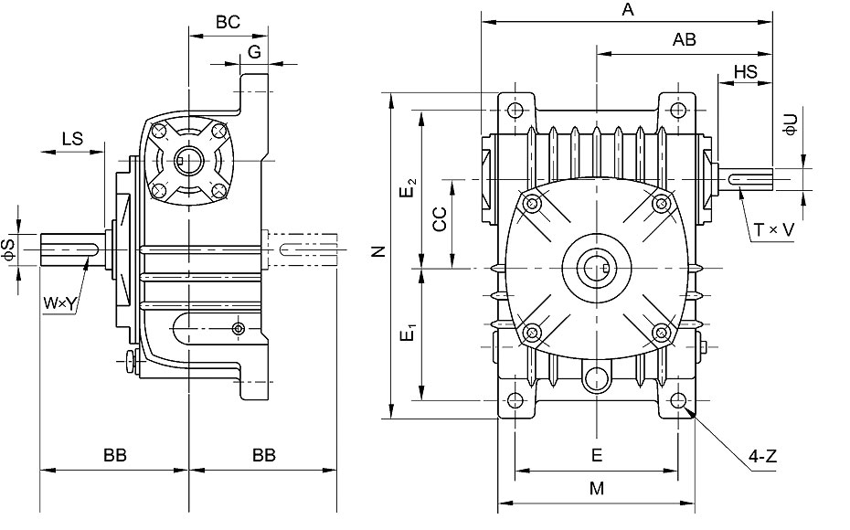 A | AB | BB | BC | CC | M | N | E | E1 | E2 | G | Z | 輸入軸Input Shaft | 輸出軸 Output Shaft | 重量 Weight (Kg) |